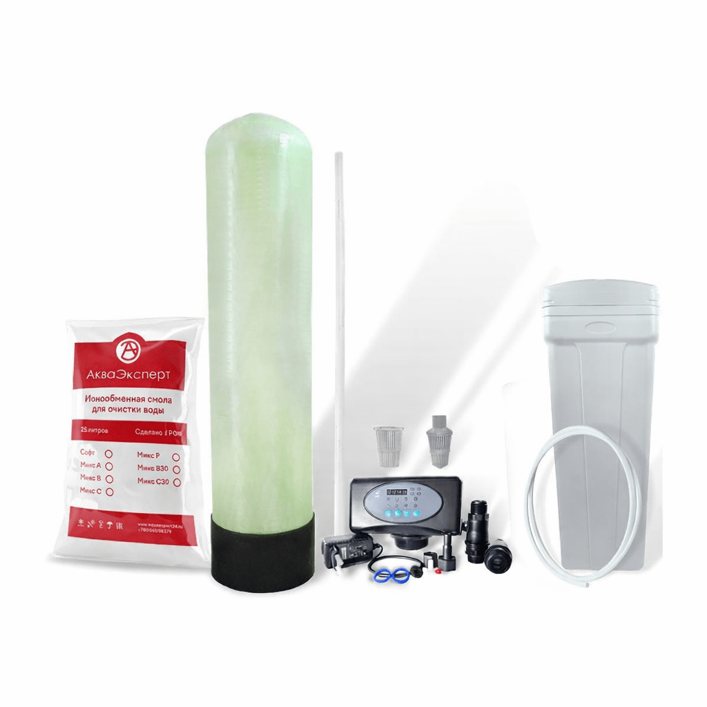 Фильтр Умягчитель для воды оснащён автоматическим по расходу клапаном управления Runxin TMF63P3, который осуществляет регенерацию(промывку) фильтрующего материала автоматически по прохождению через него определенного количества литров воды, которое вводится в настройках клапана. Режимы, время начала промывки и количество литров воды между регенерациями вводиться пользователем или монтажником, перед вводом умягчителя в эксплуатацию. Необходимое количество литров воды между промывками фильтра для воды от солей жесткости рассчитывается специалистом, исходя из показателей анализа жесткости воды и свойств фильтрующего материала. Меню предусматривает все настройки на английском языке.